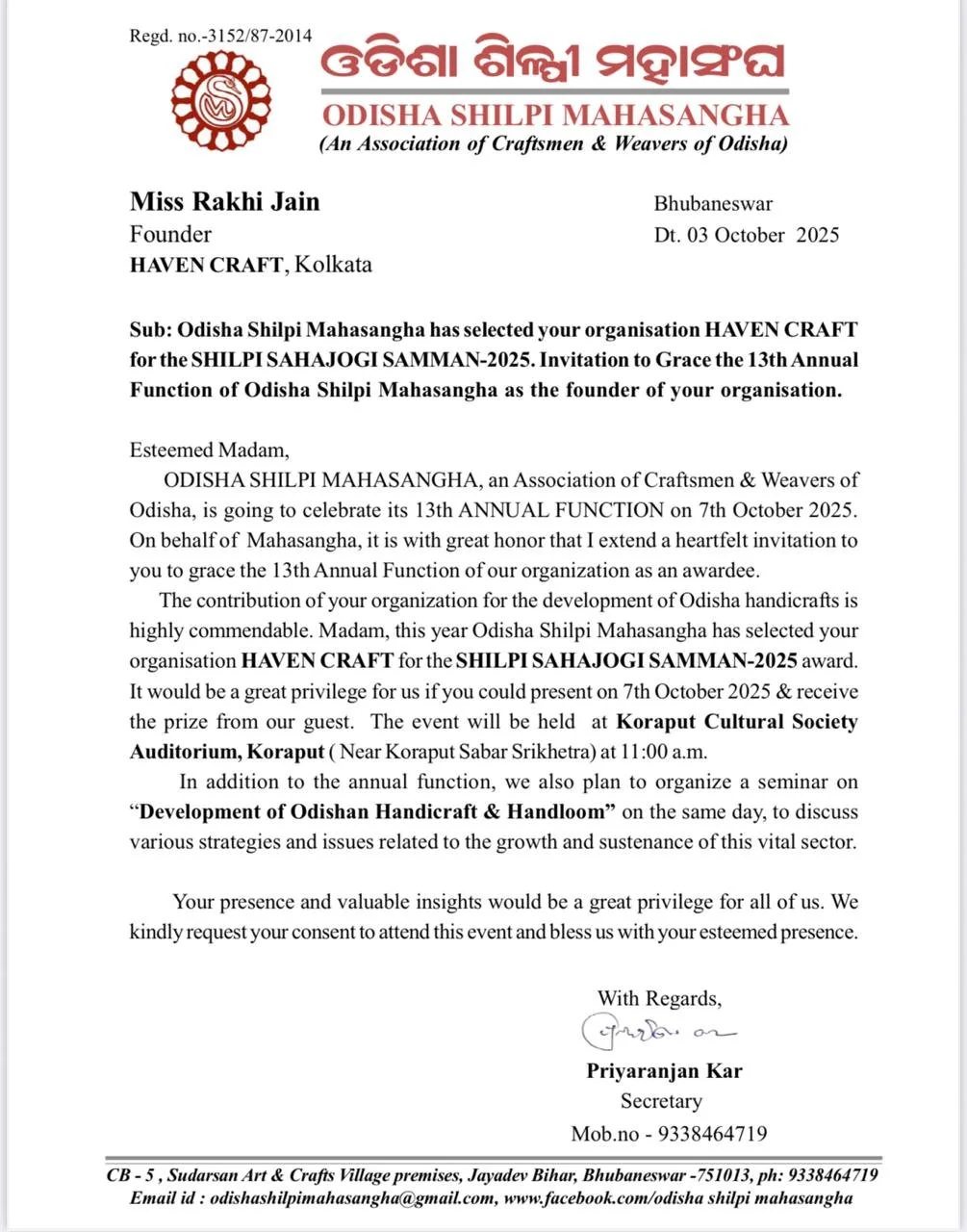 Haven Crafts is the NGO I founded where crafts are sold with 100% of proceeds received by artisans in Odisha, India.
